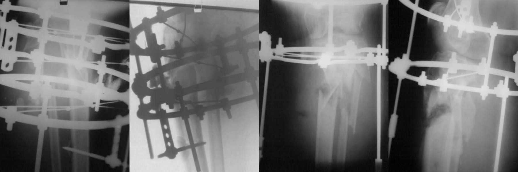 Далее - либо сращение с укорочением, либо дистракция вне зоны очага поражения. В данном случае - в нижней трети голени.