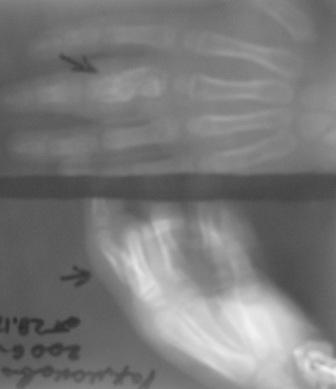 Уважаемые коллеги, на осмотре девочка 2006 г.рожд. Со слов матери 3мес. назад заметила припухлость основного фаланга 3-пальца, которая постепенно увеличилось до настоящего размера где-то в течении месяца, не болит, ребенка не беспокоит, признаки воспаления отсутствуют. Консультация онколога, биопсия - опухоль исключена (со слов матери), фтизиоортопед - тбс исключен. От основной фаланги 3 пальца к головке 4-пястной кости под кожей прощупывается хрящевидная ткань. Р-граммы от 10 декабря и 15 февраля, и фото прилагается. Что делать? Уважаемые коллеги, помогите! С уважением Абдурашид.