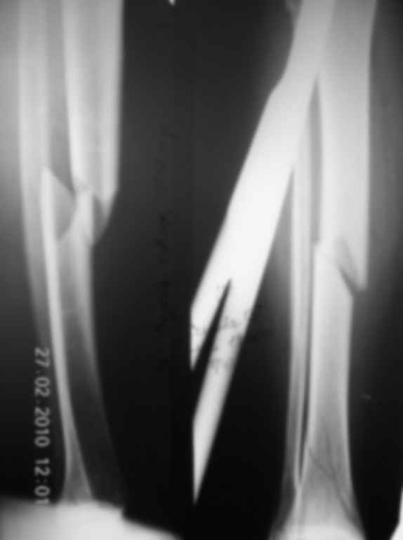 Больная С., 48 лет, поступила в отделение 2 дня назад с фрагментарным переломом костей правой голени (см. снимки). Согласна на операцию, но хочет хороший косметический результат. В отделении выполняем остеосинтез по Илизарову и накостный, БИОС не будет ещё лет 100. На покупку больным "железа" самостоятельно, после оформления соответствующих бумаг, администрация больницы смотрит сквозь пальцы. Заранее благодарю!