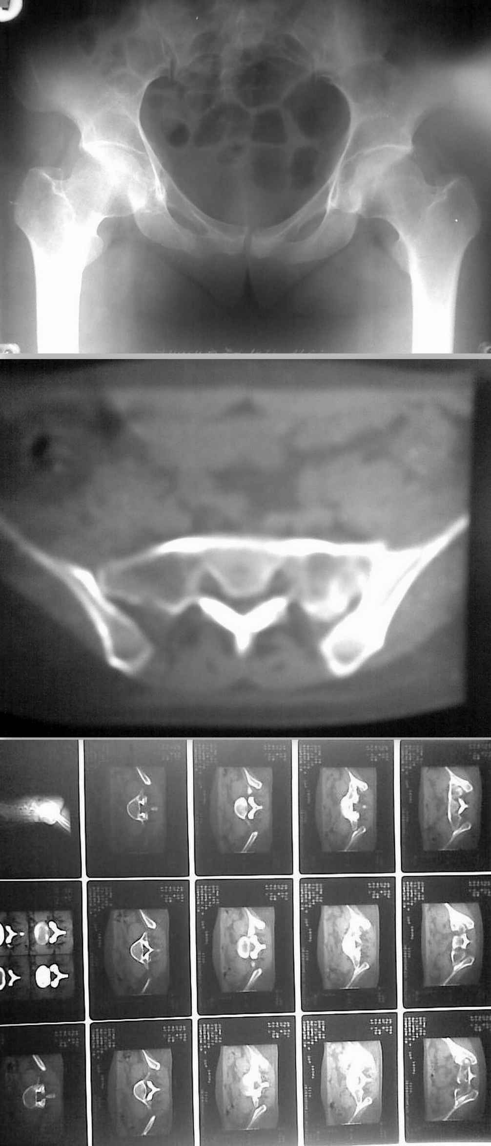 Больная 32 лет поступила в отделение 02.03.10. Травма 26.12.09 ДТП в качестве пассажира (сидела сзади, машина перевернулась). Находилась на амбулаторном(?)лечении с диагнозом "перелом седалищной кости справа". Через 2 месяца после травмы больная вертикализирована, но отмечались интенсивные боли в поясничном отделе с иррадиацией по задней поверхности бедра. Больная направлена в стационар. Выполнена КТ. Картина в приложении.