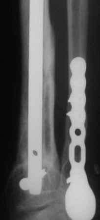 А я бы хотел еще раз подчеркнуть ключевую роль вмешательства на малоберцовой кости в подобной ситуации. В приведенном примере при открытом переломе произошла потеря большого фрагмента большеберцовой кости. Фиксация интрамедуллярным гвоздем с одним блокирующим винтом проксимально и одним дистально. Плюс стабильный остеосинтез малоберцовой. Консолидация за три месяца без костной пластики в условиях ранней нагрузки.