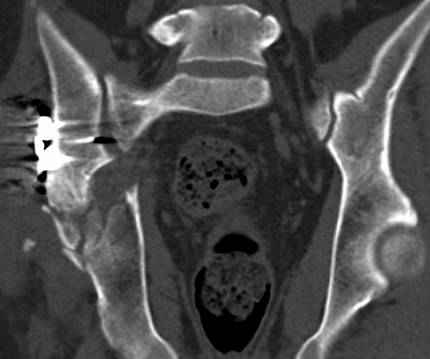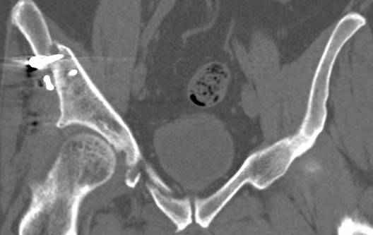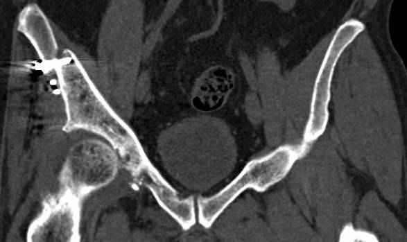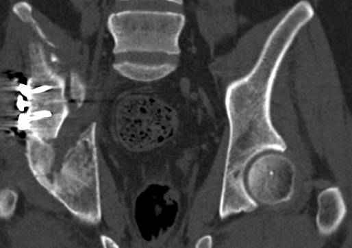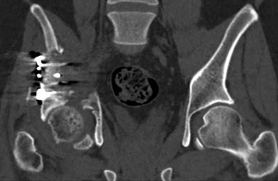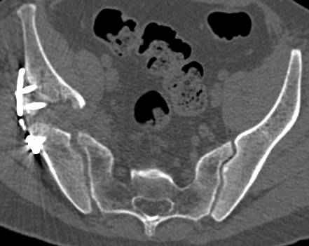 итак, второй вариант: высокий двухколонный с вовлечением КПС... Ни одно из основных повреждений не репонировано, кроме задней стенки. Скорее всего попытка реконструкции вертлуги сейчас будет очень травматичной и не очень эфективной, т.е. вероятный риск более значим, чем ожидаемая польза... Лучше подождать, и потом сразу эндопротез