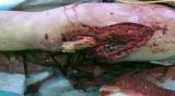 Больной 19 ти лет, пострадал в результате ДТП, пассажир мотоцикла. Получил открытый оскольчатый перелом н/3 левой бедренной кости 3a тип по Гастилло-Андерсену. При поступлении ПХО ран, фиксация стержневым аппаратом наружной фиксации. Лечение больного осложнилось развитием анаэробной флегмоны левого бедра. Лампасные разрезы, неоднократные некрэктомии, некротизировался участок диафиза левой бедренной кости на протяжении 15 см. Произведена резекция. 20.05.10- демонтаж АНФ, остеоситез левой бедренной кости гибридным циркулярно-монолатеральным стержневым дистракционным аппаратом наружной фиксации, остетомия левой бедренной кости в в/3. Сейчас начата дистракция в аппарате, проводится подготовка ран к аутодермопастике.