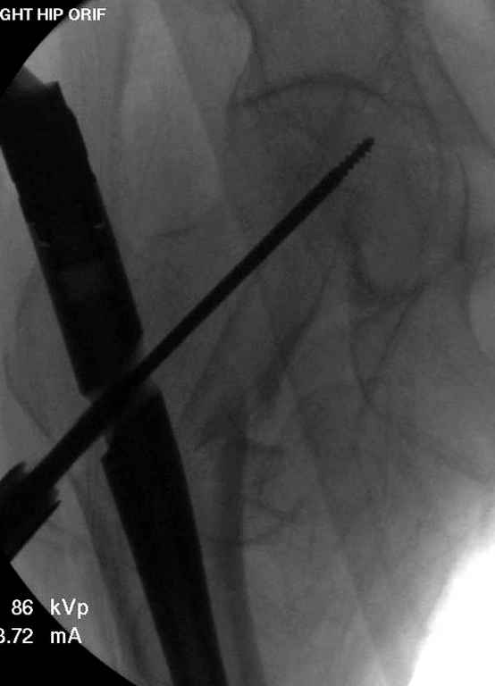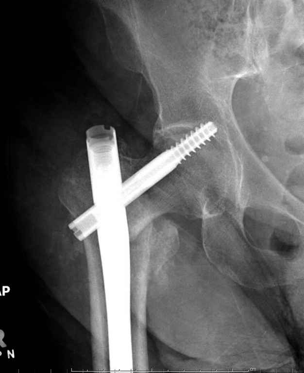 Здраствуйте. По данному снимку видно 2-а основных момента которые привели к протрузии винта в вертлужную впадину: 1) шеечный винт дистальной поверхностью наружнего края "зацепился" за латеральный кортикал бедра, это не дало сработать динамической системе гвоздь-винт. 2) лучьше шеечный винт проводить ближе к дуге Адамса, там болееплотная костная ткань. Решенее: как подготовка к эндопротезированию, реостеосинтез, можно такой же системой, но с учетом упомянутых моментов, максимальное безнагрузочное ЛФК (без боли).