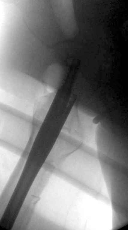 Диаметр гаммы в диафизарной части ~11 мм. А диаметр канала, тем более у пожилых с остеопорозом, может быть мм 15. Даже рассверливать обычно не приходится, после формирования широкого канала в вертельной области можно сразу толкать гвоздь, он влетает, как карандаш в стакан. Так что соответствия диаметров не бывает никогда. Однако представленная ситуация случается далеко не каждый раз. Если гвоздь в центральном отломке входит чуть медиальнее верхушки вертела, и идет вдоль передне-латеральной стенки центрального отломка, то все будет хорошо.