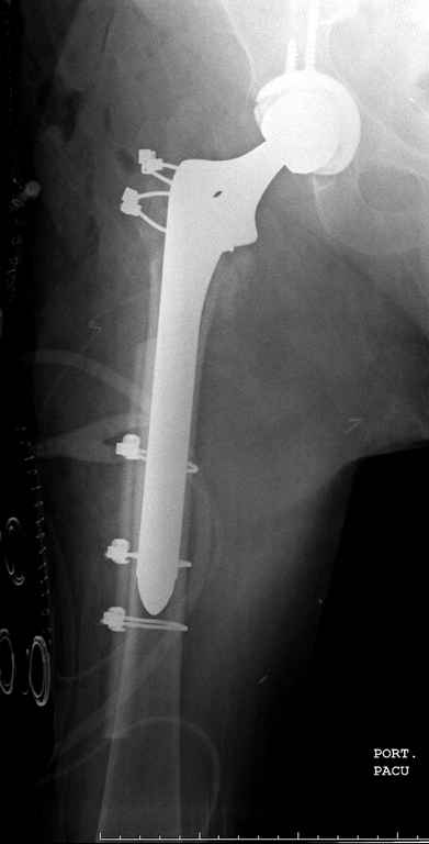 Вашему вниманию представляется похожий случай, пациентке 70, осложнился в течение одного месяца после операции. Ревизия с заменой сустава, кабельная фиксация на трохантер. При установке в дистальном диафизе обнаружен тонкий кортикальный слой и сделана профилактика от возможного перелома аллографтом.