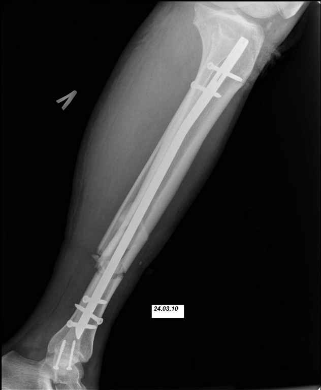 И вот опять объявился. Снимки и фотографии в приложении(первичные потеряны). Около 1 месяца назад появились боли в области нижней трети голени в проекции дистальных блокирующих винтов, передвигался с нагрузкой 50% (сам для себя так решил, сам себе разрешил). Путешествовал по Волгоградской области, обратился к травматологу, со слов перевязывали, лечили антибиотиками. Лучше не стало. Вернулся домой.