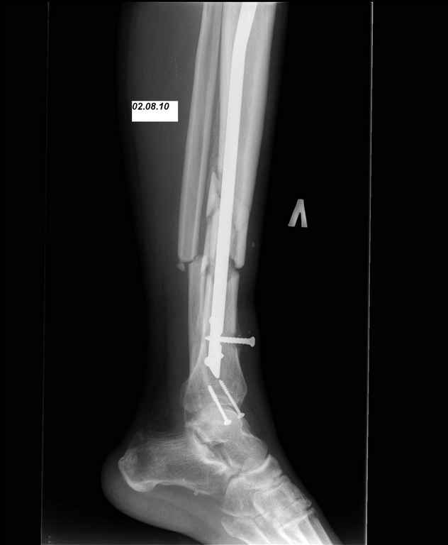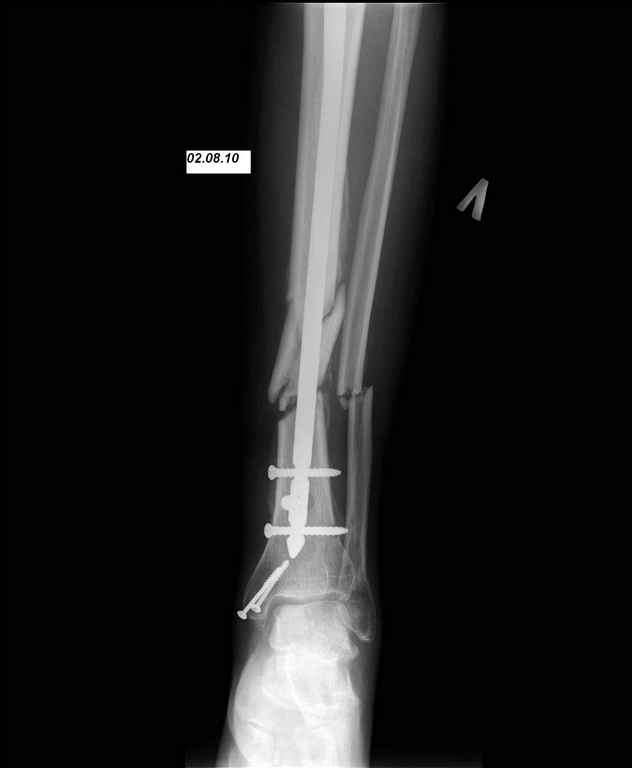 24.03.10 выполнены операции - БИОС перелома большеберцовой кости левой голени (штифт Synthes), остеосинтез перелома внутренней лодыжки левой голени винтами. Послеоперационный период протекал без осложнений. Выписан на 10 сутки. Амбулаторно не наблюдался.