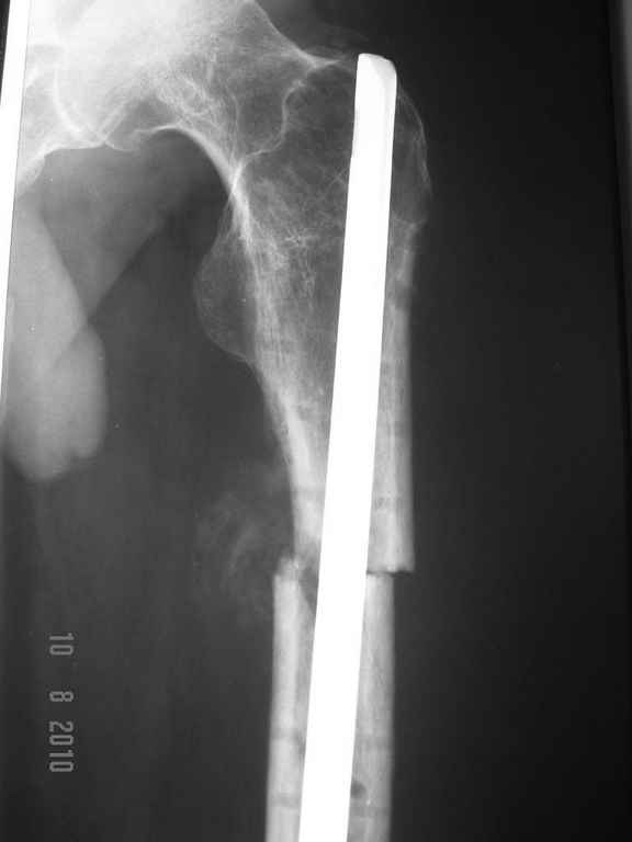 Здесь, мне кажется, не только осложнение послеоперационной раны, а также имеется технические погрешности установки гвоздя. Трохантерная точка введения гвоздя является идеальной для антеградных гвоздей, но такие гвозди имеют изгиб в 4-5 градусов. Повело в варус за счет трансляции на диафизе, а также имеется подозрение на ротацию.