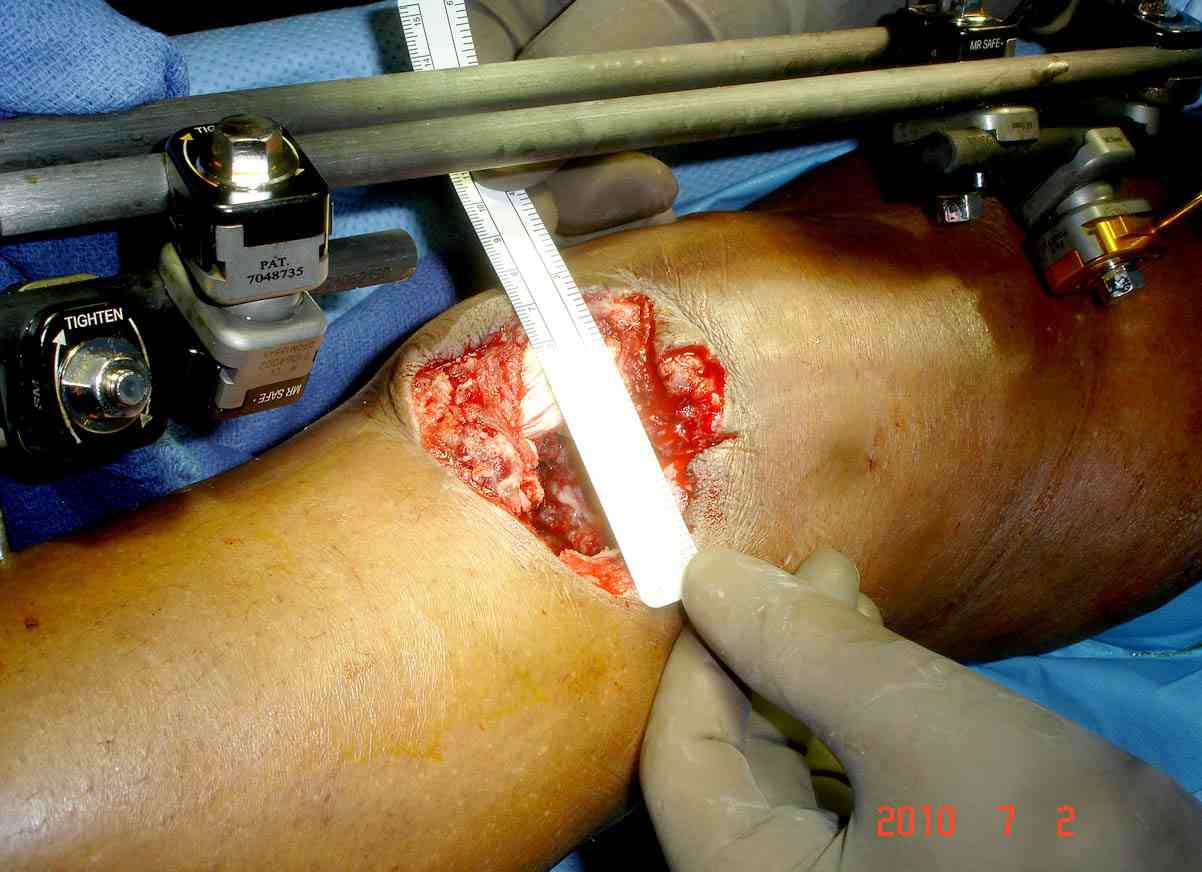 На первом этапе с задачей справляется наружный фиксатор, который создает благоприятные условия для закрытия ран и контролирует длину конечности. На данном этапе рекомендована КТ, чтобы увидеть топографию фрагментов для расчета направления фиксирующих элементов.