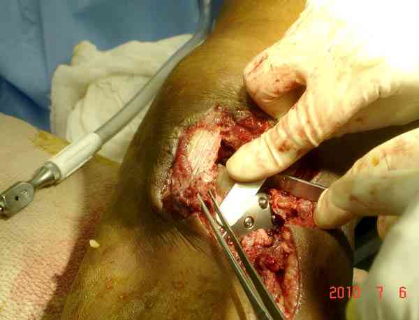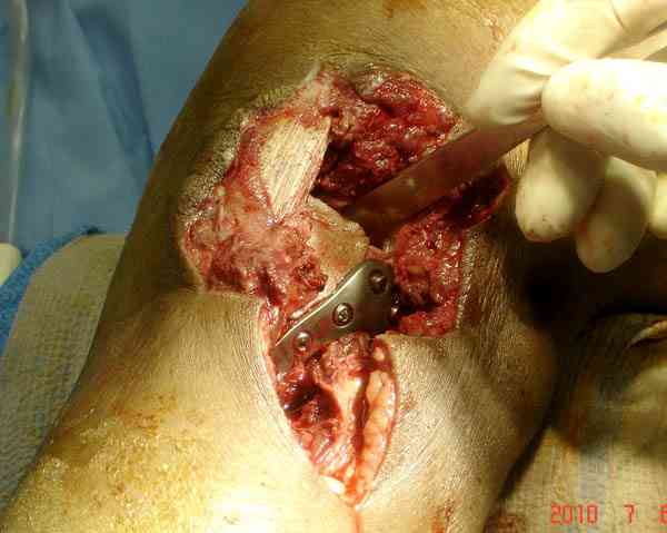 После нескольких обработок и вакуумирования, поэтапно сделана фиксация тибиального бугра шурупами. И окончательную фиксацию закончили латеральной пластиной для тибиал плато и установкой пластического материала.