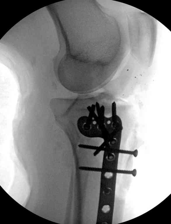 Одинокий кортикальный шуруп не удержит тибиальный бугор, сустав тибиал плато оставлен без репозиции и фиксации.