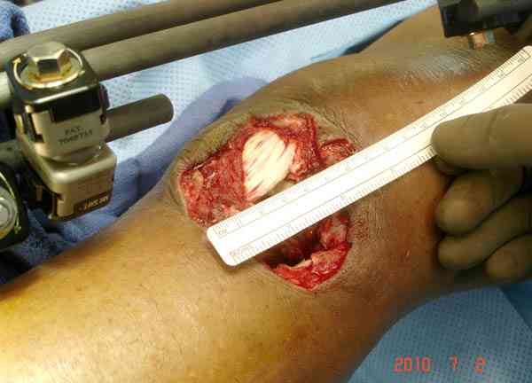 План с протезированием чересчур агрессивный, больная слишком молодая. В данный момент для удержания конструкции необходимо установить наружный фиксатор между бедром и голенью. Обработку продолжать с применением антибиотиков и вакуумирования.