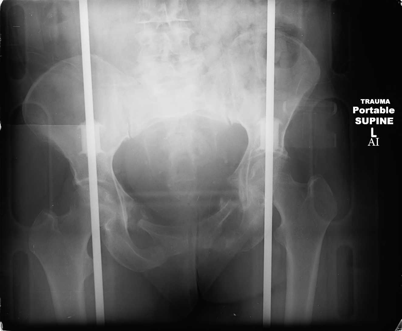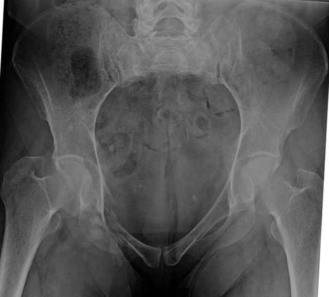 hello everyone, attached are images of a 59 yo female, admitted today after motor vehicle collision. Pt states her pelvis has been very painful ever since she fell on her buttocks from ground level a little over a year ago. medical history significant for scleroderma, raynauds syndrome, and COPD. no past surgeries.