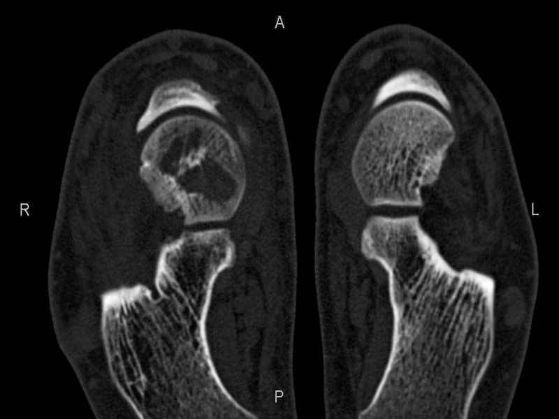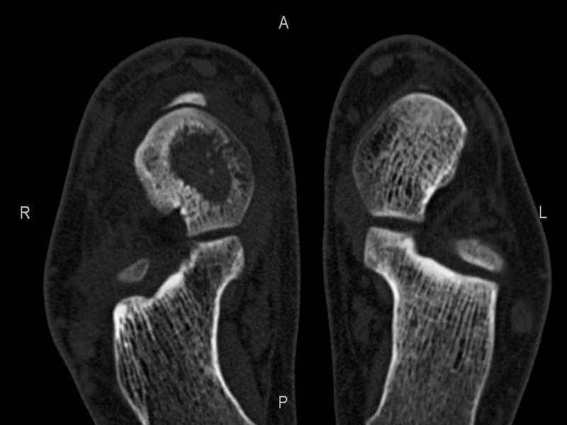 СТ чётко демонстрирует секвестр, но открыв сустав вероятно, что хрящ тарана окажется интактным и только пальпацией/ ЭОП можно будет