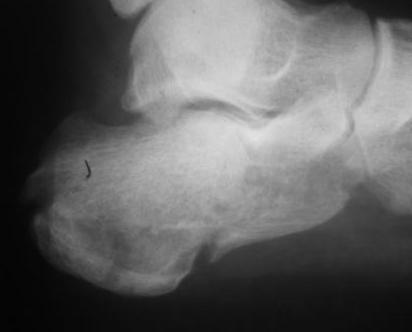 Безусловно, если есть возможность выполнить КТ подтаранного сустава и пяточной кости до оперативного вмешательства, его необходимо выполнять. Это облегчит планирование оперативного вмешательства. Но для того чтобы решить, что больному в данном конкретном случае необходима открытая репозиция перелома и остеосинтез, достаточно рентгенограммы. Форма пяточной кости сохранена и после репозиции просевшей суставной поверхности пяточной кости угол Белера будет восстановлен. Другим способом, кроме открытой репозиции, поднять просевшую суставную поверхность пяточной кости не представляется возможным. L-образный разрез с латеральной стороны, огибающий латеральную лодыжку. Разрез не должен иметь острых углов (всегда присутствует угроза некроза кожи), сразу доходить да пяточной кости. Отсепаровывать лоскут необходимо сразу от латерального кортикального слоя пяточной кости. В данном случае не следует располагать разрез слишком низко к подошвенной поверхности стопы, так как потребуется только вскрыть подтаранный сустав. Отводятся кверху сухожилия малоберцовых мышц, приподнимается и отводится в сторону сломанная кортикальная пластинка латеральной поверхности тела пяточной кости, поднимается элеватором кверху просевшая суставная поверхность пяточной кости и плотно прижимается к суставной поверхности таранной кости. Проводится две спицы, диаметром 2 мм через пяточный бугор, репонированную суставную поверхность пяточной кости в таранную кость. Скорее всего, потребуется костная пластика образовавшегося дефекта в пяточной кости спонгиозным костным трансплантатом из крыла подвздошной кости. Поскольку у больного повреждены все конечности и вертикализировать его в ближайшие три месяца вряд ли представляется возможным, фиксация двумя спицами будет достаточной. Выполняется интраоперационная рентгенография в двух проекциях. Латеральная кортикальная пластинка тела пяточной кости укладывается на место. Дополнительной её фиксации, как правило, не требуется. Обычно, мы заканчиваем операцию дренированием раны дренажной системой низкого вакуума.