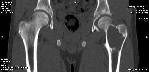 При обследовании выявлена киста шейки левого бедра с сопутствующими изменениями в головке бедра, которые мы трактуем как дистрофические.