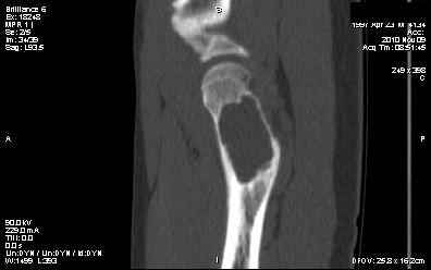 Насчёт диагноза - более чем уверен, что это солитарная костная киста. В плане лечения опимально эластичный интрамедуллярный остеосинтез стержнями или спицами без нарушения корткального слоя. Так же стандартное пункционное лечение по рекомендациям ЦИТО 85г., 90г. Берерный А.П.
