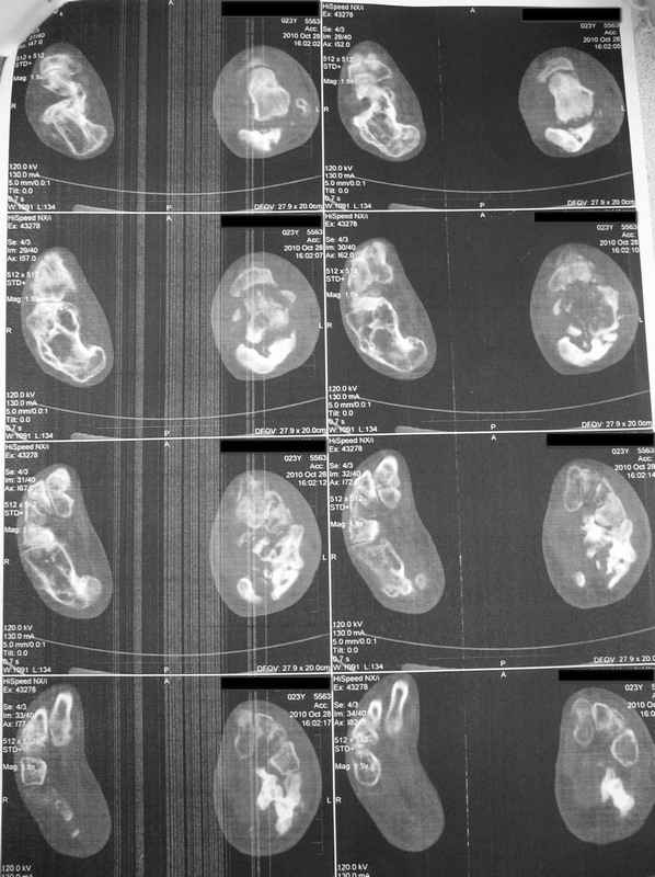 Молодая девушка со сросшимися многооскольчатыми переломами пяток и голеней.Young girl with fractures of the calcaneus Больная Н., 25 лет, падение с высоты (2008 г.). Жалобы на боли в области голеностопных суставах, в области пяток при ходьбе. Лечилась в аппаратах внешней фиксации по поводу открытых оскольчатых переломов обеих голеней, переломов пяток. Далее по поводу несросшихся переломов голеней –ЧКОС аппаратами внешней фиксации. Переломы срослись, аппараты демонтированы весной 2010г. В левой пяточной области в месте проведения спицы имеется сукровичное отделяемое. При ревизии гноя нет. Чем помочь девушке?