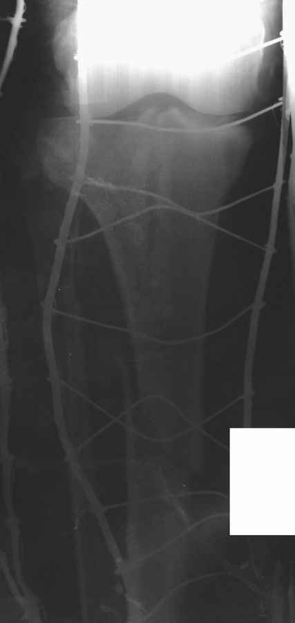 Пациенту сделали КТ - ухитрились сделать на шине Белера (не давал положить прямую ногу) - срезали передний отдел. Планируется на пятницу (24.12) на операцию - синтез длинной мыщелковой LCP-пластиной Synthes :). Отек ближе к слову умеренный (окружность голени +4 см по сравнению со здоровой). КТ и снимок на вытяжении прилагаются.