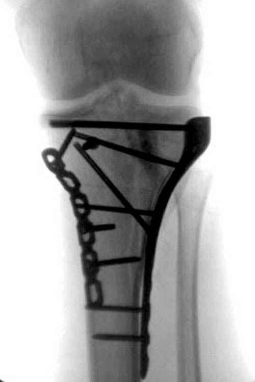 Такая ситуация характерна для многих, когда принимается ошибочное решение, т.е пытаются фиксировать одним имплантом переломы двух мыщелков. Латеральная пластина приемлема только для тех случаев, когда сохраняется интактным медиальный диафизарный кортекс и отсутствует фрагментация на верхушке медиального перелома.