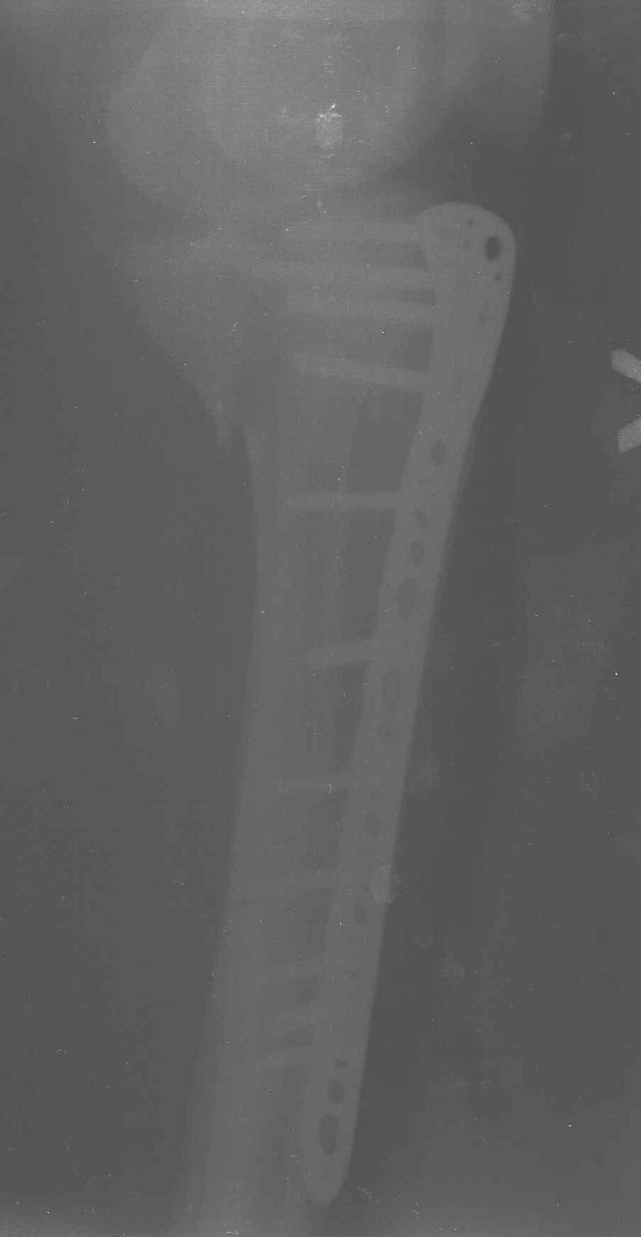 Уважаемые коллеги! В прошлую пятницу больной прооперирован - как и планировалось мыщелковая LCP от ChM. Малоинвазивно не получилось - один большой доступ :(. (но с минимальным скелетированием б/б кости). Наружный мыщелок собрали, но по контролю видно, что задне-медиальный отдел метаэпифиза смещен. Фиксировать не стали (?). 4-е сутки после операции - по м/тканям без проблем. Дополнительная иммобилизация синтетическим тутором.