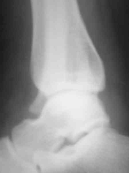 Механизм травмы - подвернул ногу. На боковом снимке видно, что латеральная лодыжка поломана на уровне голеностопного сустава. Во время травмы, кроме воздействия крутящего момента на кости голени, происходило еще и стремительное движение тела больного вниз вместе с проксимальным отломком малоберцовой кости (сила земного притяжения), вследствие чего разрывается межкостная мембрана, передняя межберцовая связка (lig.tibiofibulare anterius), рудиментарная поперечная связка. На боковом снимке конец проксимального отломка ( в данном случае место прикрепления передней межберцовой связки) находится на уровне середины таранной кости. Соответсвенно, последняя разорвана. Смещение отломков костей голени по длине - около 2 см.