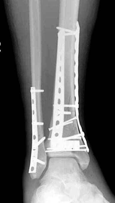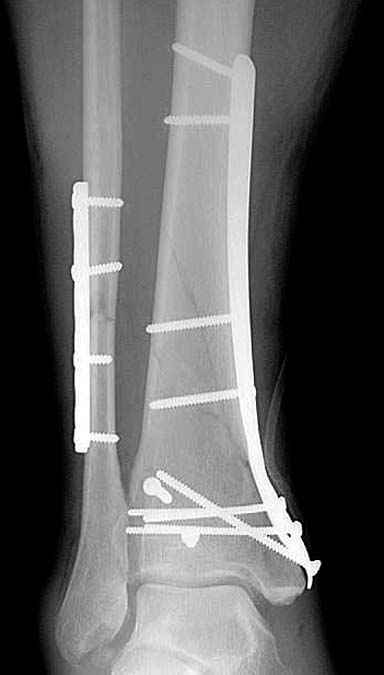 Без современных материалов создать хорошую фиксацию становится трудной задачей, и этот случай характерен тем, что достигнутую идеальную репозицию испортили старомодной техникой. Исследования показали, что спонгиозные шурупы в метафизарных частях не создают механические преимущества как считали раньше. Кортикальные винты менее агрессивны и не оставляют дефекта кости после их удаления.