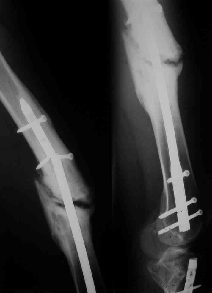 Это произошло бы с меньшей вероятностью, если бы нагрузку своевременно перенесли на костные отломки, которые изо всех сил пытались воссоединиться (о чем говорит наличие неслабой мозоли), да мешала распорка в виде блокированного статически гвоздя.