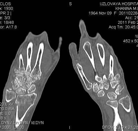 Теперь вопросы: 1.Прошу объективно оценить качество нашей репозиции на момент 21.12. (неужели так плохо?). Что на снимках при снятии гипса- сам вижу. 2. сравнить снимки РКТ (с двух сторон)- так ли велико укорочение лучевой кости и лучелоктевой диастаз. 3. Ваши мнения, в отношении целесообразности оперативного лечения учитывая ВСЕ вышеизложенное. 4. На всякий случай для суда- мог ли я тракцией в 2- 3 кг за 1 и 2 пальцы под внутривенным наркозом неправильно вколотить отломки и травмировать локтевой нерв. Кстати, в США если врач пациенту говорит, что его плохо лечили- то этого врача лишают лицензии. У нас наооборот- обгадить другого милое дело. И это процветает. От себя же могу сказать, что никто в нашем отделении так не поступает. Коллеги, будьте осторожны в своих высказываниях. От осложнений и ошибок никто не застрахован. А в данном случае многое будет зависеть от заключения консультантов поликлиники ЦИТО, куда больная направлена областным травматологом на 03.03 для решения вопроса о дальнейшей тактики лечения. С уважением ко всему травматологическому сообществу Дедок Михаил.