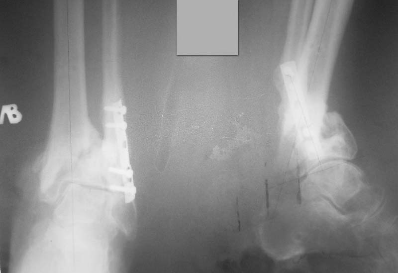у меня сейчас лежит больная с Шарко голеностопа, оперированная этим способом в понедельник. к сожалению, послеоперационные рентгенограммы я еще не сфотографировал. То, чтоесть - это вид сзади на голеностоп до операции и перед закрытием раны