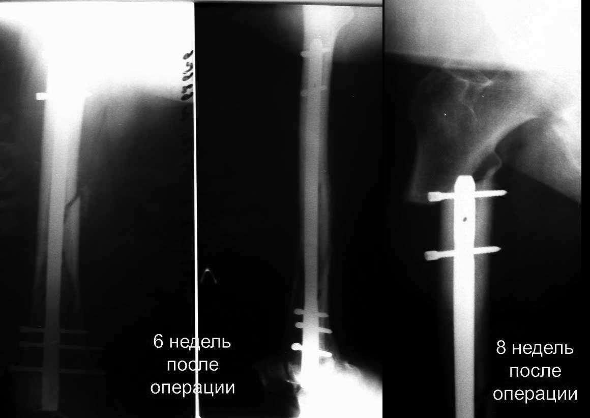 Тем более, что в данном случае верхняя треть бедренной кости и так ослаблена отверстиями от винтов пластинки. Поэтому, наш план оперативного лечения состоял бы в следующем. Анестезия предпочтительно спинномозговая. Положение больной на здоровом боку. Спицевой дистракционный аппарат. Удаление всех металлоконструкций. Если в аппарате достигнута дистракция, то для репозиции отломков останется в нижнем углу раны устранить смещение отломков по ширине, зафиксировав их костодержателем. Антеградный остеосинтез блокированным стержнем на уже репонированном переломе, что намного сокращает время вмешательства. Необходимо обратить внимание, что в данном случае точка входа в канал бедренной кости будет проецироваться не на piriformis fossa, a несколько медиальнее из-за медиализации бедра.