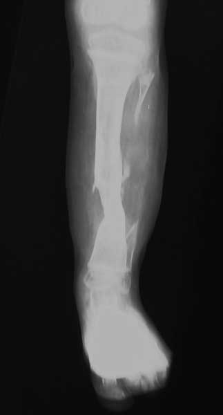 Больной 11 лет. Врожденный ложный сустав нижней трети правой большеберцовой кости. < | >