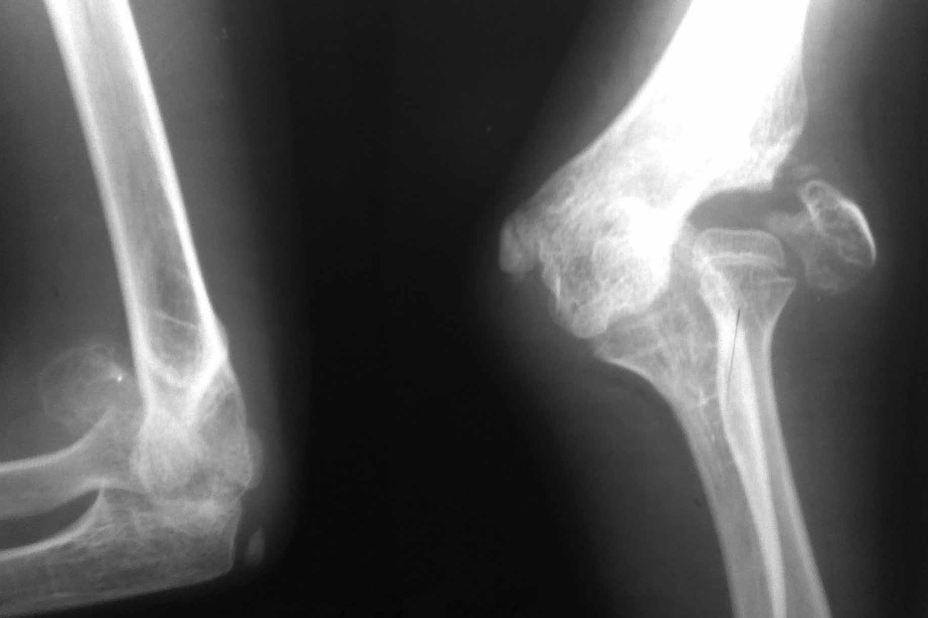 /Объективно: Вальгусная деформация локтевого сустава 25-30град. По наружной поверхности пальпируется тугоподвижный костный фрагмент головчатого возвышения. Функция сустава сохранена в полном объеме, безболезненна.Рентгенограмма прилагается.