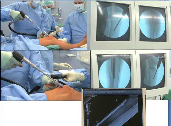 Уважаемые коллеги. Хотелось бы услышать Ваше мнение по следующему случаю. На лечении в отделении находится пациент 45 лет. С диагнозом: Замедленно консолидирующийся надмыщелковый перелом левой бедренной кости фиксированный пластиной от 06.12.10. Ложный сустав большеберцовой кости левой голени фиксированный АНФ от 06.12.10. Жалобы: на невозможность активного сгибания в левом коленном суставе, нарушение опорной функции левой нижней конечности, укорочение левой нижней конечности на 5,0 см. Анамнез: травма 18.06.10 в результате ДТП, водитель. Диагноз: Сочетанная травма головы, конечностей. ЗЧМТ. Сотрясение головного мозга. Открытый многооскольчатый внутрисуставной перелом мыщелков и нижней трети левой бедренной кости со смещением отломков. Открытый перелом костей левой голени в верхней трети со смещением отломков. Обширные рвано – ушибленные раны левого бедра, верхней трети левой голени. Находился на лечении в нескольких стационарах, где проводились оперативные вмешательства. 1. 18.06.2010 г. - ПХО открытого перелома костей левой голени, фиксация переломов костей левого бедра, голени в АНФ. 2. 08.07.2010 г. перемонтаж АНФ на левом бедре, голени, хирургическая обработка ран левой голени 3. 13.07.2010 г. кожная пластика гранулирующей раны левой голени перемещенным кожным лоскутом и свободная кожная пластика расщепленным кожным лоскутом. 4. 27.07.2010 г. перемонтаж АНФ на левом бедре, голени, вторичная хирургическая обработка ран левой голени. 5. 09.08.2010 г. – свободная кожная пластика гранулирующей раны левой голени. 6. 01.12.2010г.: Демонтаж АНФ с левого бедра, голени. 7. 06.12.2010г. Открытая репозиция, остеосинтез чрезмыщеково – надмыщелкого перелома левой бедренной кости пластиной со свободной костной пластикой из гребня левой подвздошной кости (во время операции из за сомнений в жизнеспособности костного отломка перелома бедра произведено его удаление. За счет чего образовался дефект костной ткани и укорочение левого бедра на 5,0 см; Мыщелки бедра были в сгибание, 5 месяцев нога не опорная, при попытке их репонировать крошились , зафиксировали как стояли. Остеосинтез переломов костей левой голени в АНФ. Местно: Ходит при помощи костылей с попыткой полной нагрузки на левую ногу. Левый коленный сустав в положении разгибания. Движения в коленном суставе качательные. Воспалительных явлений области послеоперационных рубцов, мест выхода спиц нет. Анализы крови без воспалительной реакции. На сегодня: с момента травмы прошло 10 месяцев. Вопрос, что делать: 1. С бедром. 2. С голенью. 3. С коленным суставом. Мысли: №1. Оперативное лечение провести в два этапа. В первый этап голень, второй этап через 1 месяц бедро и коленный сустав. Голень: выполнить остеосинтез левой большеберцовой кости интрамедуллярным стержнем с рассверливанием. На основании боковой рентгенограммы коленного сустава мыщелки бедра в сгибании, голень в переднем подвывихе, создается впечатление, что удастся завести стержень при такой контрактуре, или выполнить отсечение бугристости, попытаться согнуть колено и заштифтовать. Есть ли опыт штифтования при стойких контрактурах? Бедро, коленный сустав: через 1 месяц срединным доступом с отсечение бугристости большеберцовой кости произвести реостеосинтез надмыщелкого перелома бедра с выведением мыщелков из сгибания. Коленный сустав: мобилизация головок четырехглаво