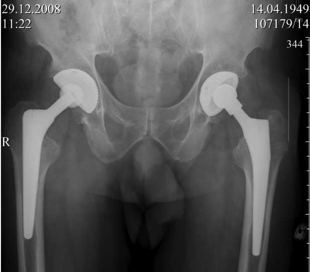 В конце 2008 года отметил боли в правой паховой области при опоре на правую ногу. На рентген снимках таза с тазобедренными суставами явных признаков нестабильности вертлужного компонента не обнаружено. В 2009 году нейрохирурги его "успешно" прооперировали на L\3-\4 связывая болевой синдром в правой паховой области с наличием грыжи указанного межпозвонкового диска. Состояние только ухудшилось, больной уже не мог долго сидеть, боль прогрессировала . Его в 2009 и 2010 годах смотрел ортопед, делались рентгенснимки, но почему то приходили к выводу что эндопротез справа стабилен. В марте 2011 года я впервые увидел его, через одну неделю после этого был прооперирован. На операции вертлужный компонент при упоре на него инструментом прокручивался во впадине и без труда был извлечен.