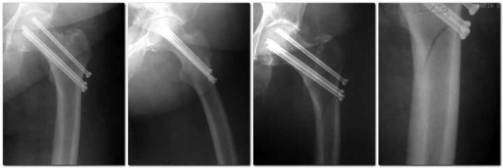 из МЛПУ ГБСМП№2 1-е травм отд. г.Ростов-на-Дону Пациентка Ш. 76 лет, 11 дней назад прооперирована по поводу вколоченного субкапитального перелома шейки левой бедренной кости, 3-мя канюлированными винтами. Вчера пациентка упала в палате. И вот результат- подимплантатный подвертельный перелом левой бедренной кости.