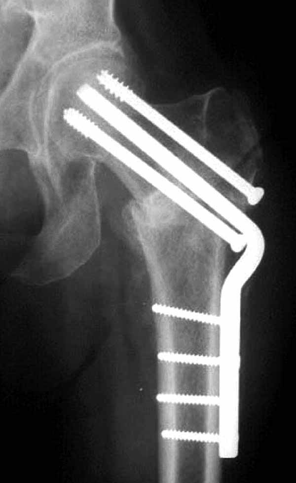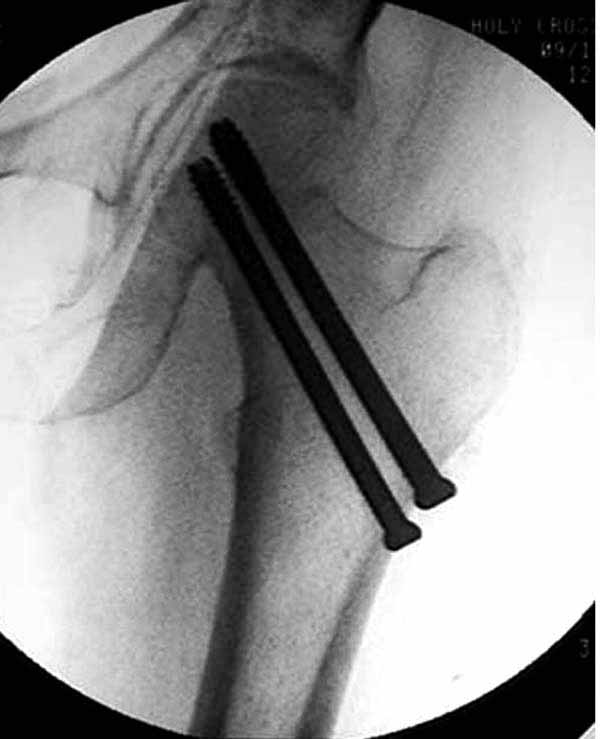 два в нижней части шейки. Более стабильная структура как раз обратная: два шурупа в проксимальной части шейки , и не дальше центральной части головки, иначе есть риск пенетрации. дистальный винт мог бы быть выше уровня малого вертела. Его дистальное расположение описано с увеличенным риском послеоперационного перелома.