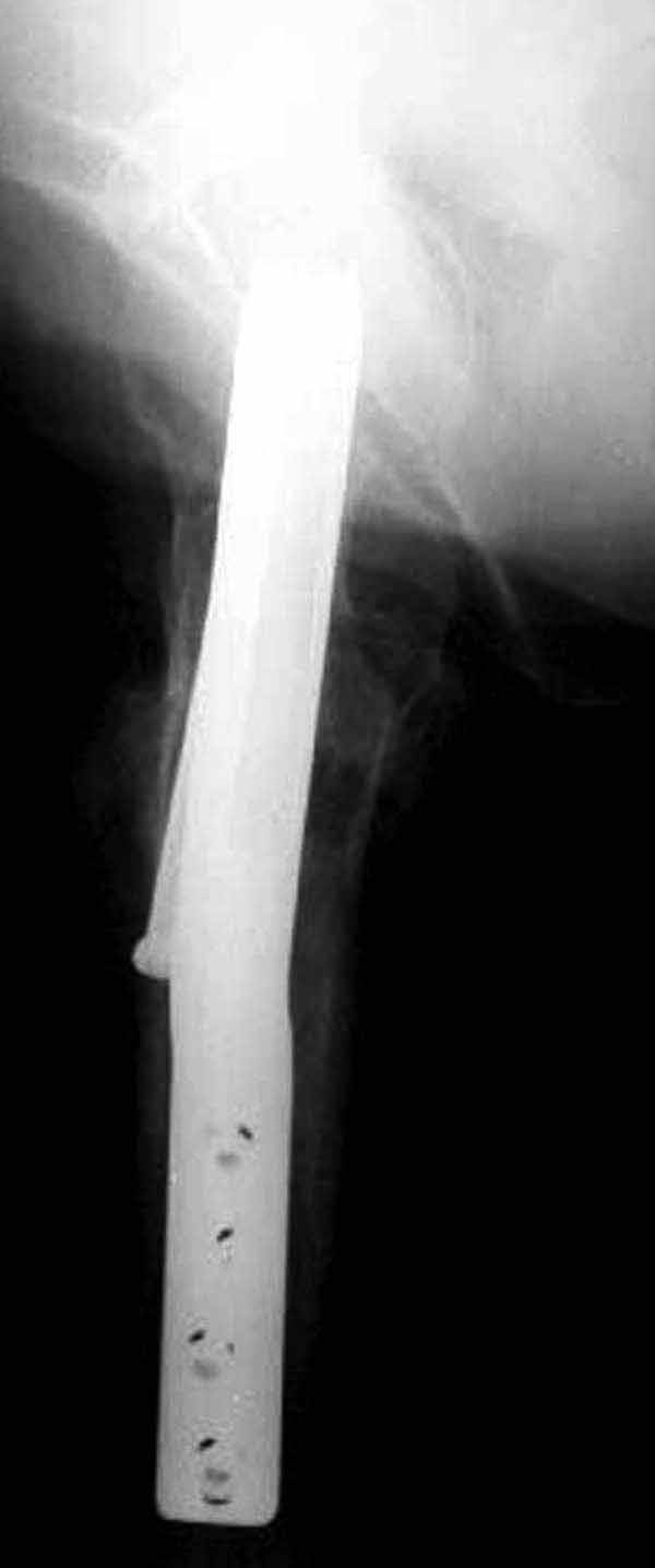 Здесь подобный случай, где стрессовый перелом обнаружен через 2 недели после фиксации. Применен Blade Plate с дополнительными шурупами.