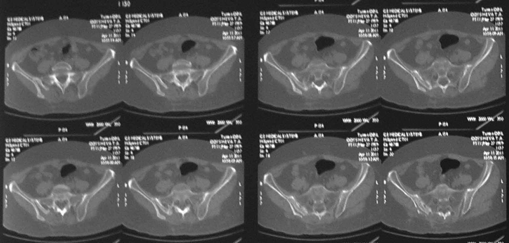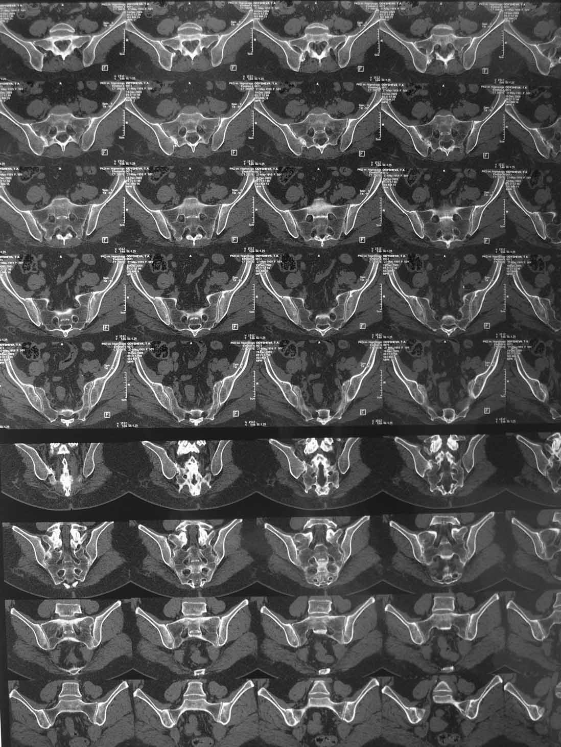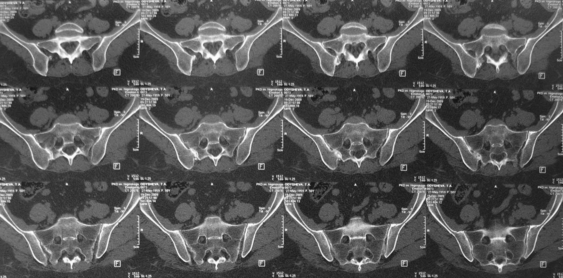 На первичных КТ от 19-12-2009 определяется частичное анкилозирование правого крестцово-подвздошного сочленения, а на последних, от 11-04-2011 протяженность анкилозированной зоны значительно больше - сакроилеит прогрессирует, (с левой стороны вроде тоже признаки сакроилеита появились - не очень понятно из-за качества снимка). Значимых дуральных и радикулярных конфликтов действительно нет. "расслоение кости" - рентгенологически выглядит как травматический перелом подвздошной кости. Что делать? - наверное, искать серонегативные спондилоартропатии у ревматолога.