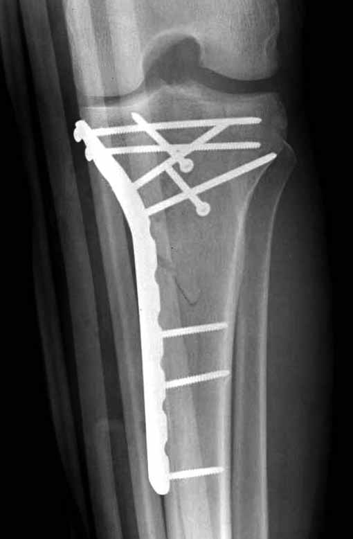 "участок некроза кожных покровов (см. фото), поэтому латеральная мыщелковая пластина не подойдет, а медиальных пластин у фирм-производителей нет. Пациент может приобрести современный имплант, но какой?"