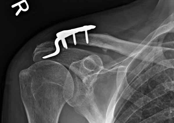 Теоретически можно использовать и короткую пластину. Но на операции дистальный отломок( акромиальный конец ключицы ) был коротким и оскольчатым, поэтому крючок и использование там блокированных винтов в пластине было очень уместно. Доступ - "сабельный удар". Точка введения крючка - сразу сзади от ключично-акромиального сустава. Если честно - больше внимания уделяли репозиции отломков и адекватному расположению пластины на ключице :-) крючок проверяли на прочность фиксации за акромион и полный объем движений в плечевом суставе. После операции рука на косынке, нагрузку ограничили. Снимки есть в нормальном разрешении, но здесь "размер файла не превышал 75 кб." Если есть необходимость залью в пикассу...