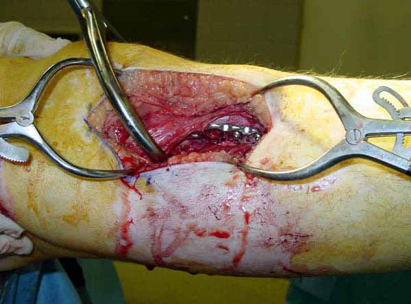 На снимке типичный перелом медиального тибиал плато с передним смещением (подвывих) по Schatzker IV. Консервативное лечение без медиальной опоры не может удержать деформирующие силы, и из-за вторичного смещения мыщелка конечность смещается в варус. Кроме передних смещений еще встречаются сложные фронтальные варианты переломов, и тогда голень подвывихивается кпереди.