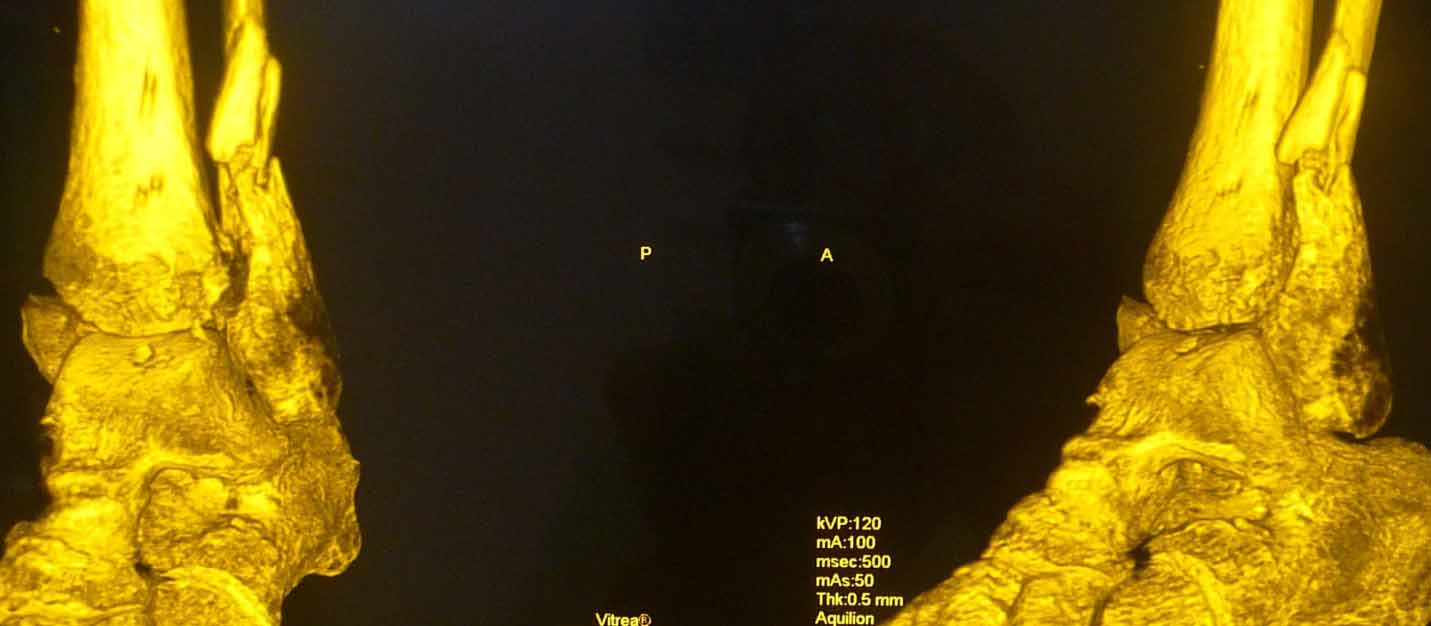 из Уважаемые коллеги. Не так давно на форуме коротко обсуждались возможные последствия трансартикулярной фиксации голеностопного сустава при переломовывихах лодыжек. На днях довелось увидеть КТ после удаления спиц. Картинки наглядные и, практически, не нуждаются в комментариях. Одна из спиц, кстати, проходила через фрагмент заднего края.