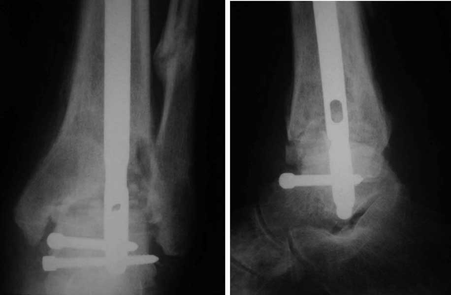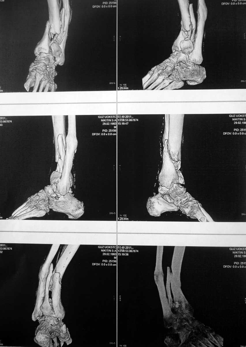 После таких повреждении вряд ли удастся сохранить сустав, и все таки, первым этапом можно было предложить реконструкцию суставной поверхности с реконструкцией в области ложного сустава. Приходилось наблюдать более сложные разрушения сустава, и больные после суставной реконструкции в течение длительного времени без особых жалоб нагружали конечность. Затем по необходимости артродез, а там уже не играет роль метод фиксации: гвоздь, пластина или аппарат.