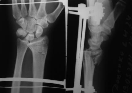 Накостный остеосинтез более стабильный в данном случае жэто верно, но и более травматичный, т.к. достоверно выставить фасетку луча можно только при артротомии и визуальным контролем, ЭОП не всегда дает объективную картинку, либо с помощью артроскопа. Артротомия негативно скажется на дальнейшей функции кистевого сустава. Аппаратный метод в случае внутрисуставного перелома минимизирует травму от лечения и даже в случае неполной репозиции суставной фасетки функция кистевого сустава на выходе будет лучше и восстановится значительно быстрее. Мое очень субъективное мнение что накостный остесинтез более адекватен при внесуставных переломов дистального эпиметафиза лучевой кости, когда репозиция не требует выполнения артротомии.