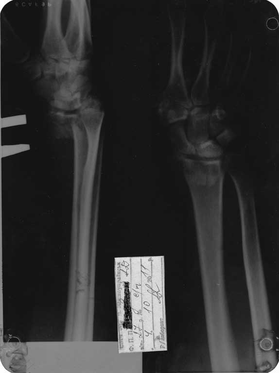 Но при повторной репозиции с экстензией кисти к тылу было отмечено недостаточное смыкание отломков суставной фасетки луча.