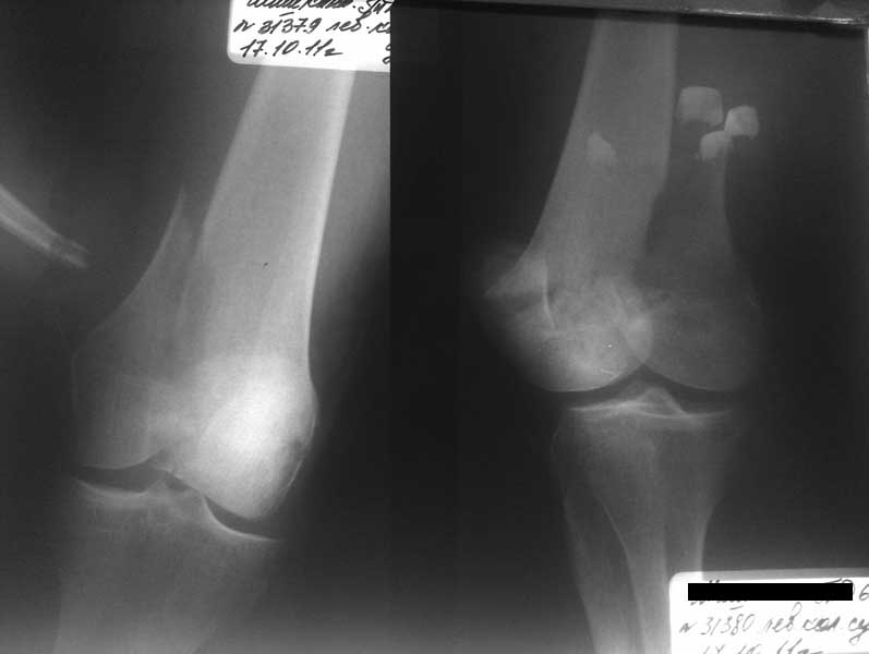 Коллеги, извиняюсь за задержку с результатом. Через медиальную артротомию обнажили н/3 бедра, отрепонировали внутренний мыщелок, затем по нему сопоставили суставную поверхность бедра с латеральным мыщелком.