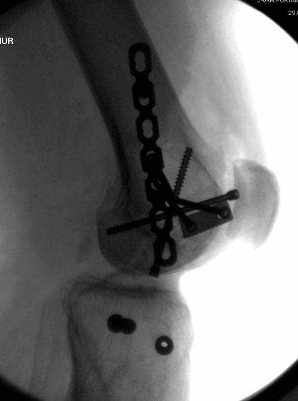 Так что можно и закрыто джойстиками под контролем сопоставить мыщелки, прошить спицами, а потом синтезировать пластиной для дистального бедра, стержнем анте- или ретроградно, или аппаратом. Не получается джойстиками - небольшую артротомию сделать.