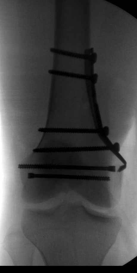 По снимку вроде одиночный простой мыщелковый перелом, и такой внутрисуставной перелом не обязательно дистрагировать на скелетном вытяжении, потому что не не нарушается непрерывность колонны с одной стороны. И для таких простых переломов подойдет любой метод: 95 градусная пластина, Lat. Condylar Butress пластина или ретроградный гвоздь. А для особых энтузиастов которые желают антеградную фиксацию, возможно легко найти трохантер у алкоголиков или дистрофиков. А вот у откормленных Макдональдскими гамбургерами? Если поискать у них тоже можно найти, но стоит ли?